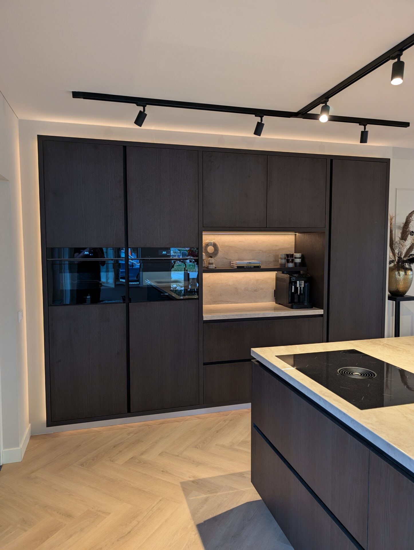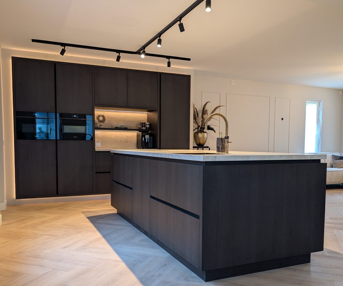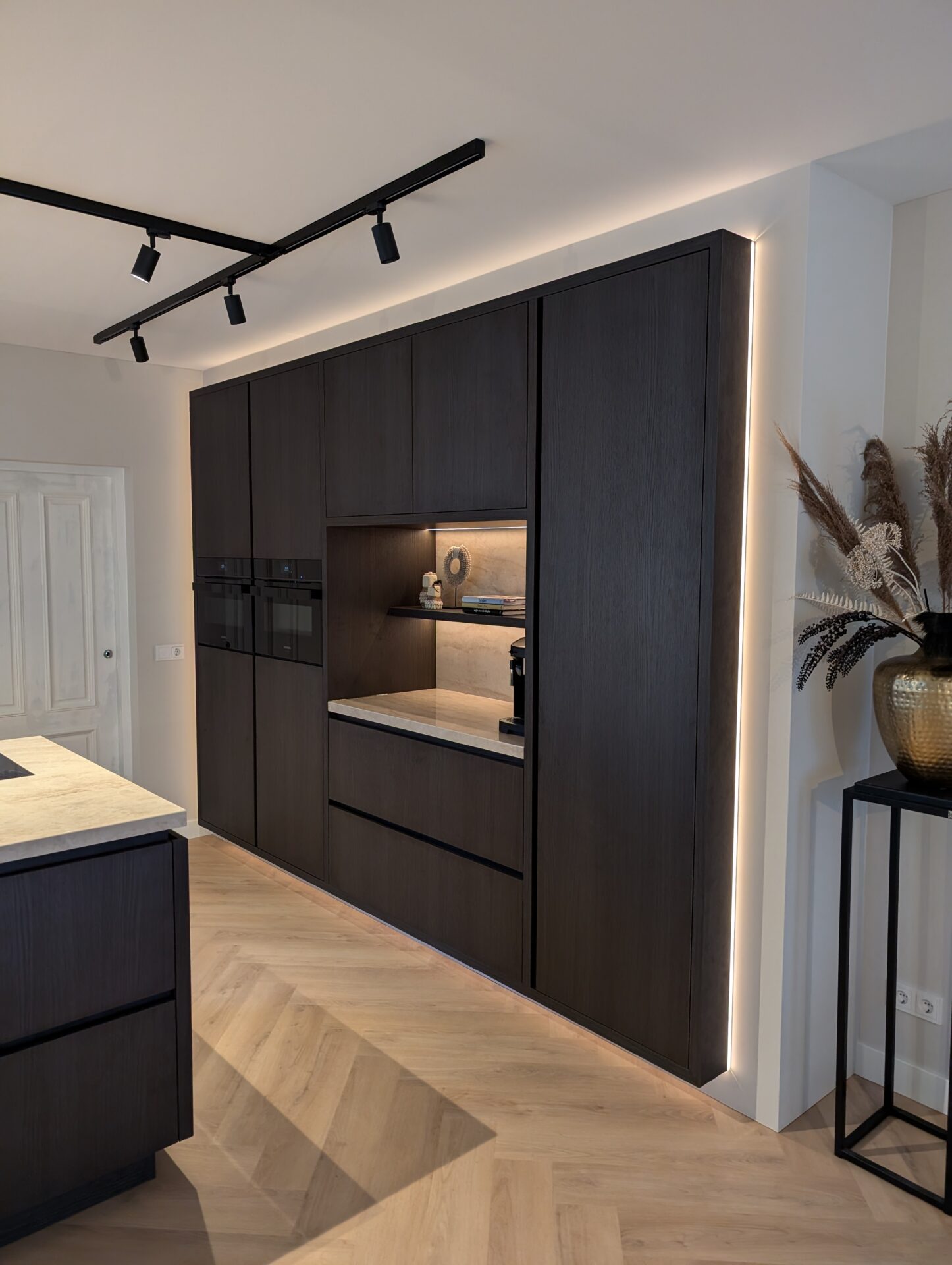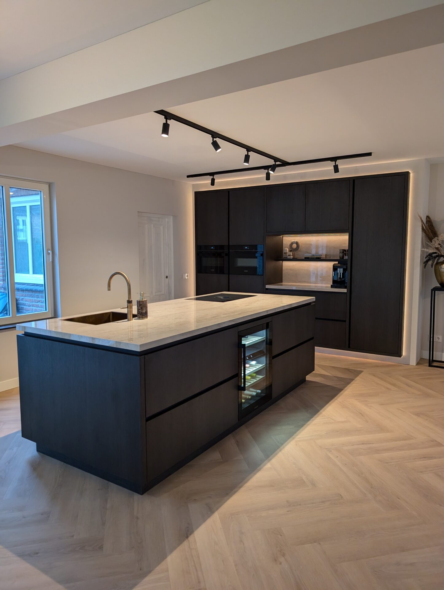 Deze keuken combineert strak design met warme materialen. Het donkere hout en het lichte werkblad zorgen voor een luxe uitstraling, terwijl het kookeiland met wijnklimaatkast en nis verlichting zowel functioneel als sfeervol is.