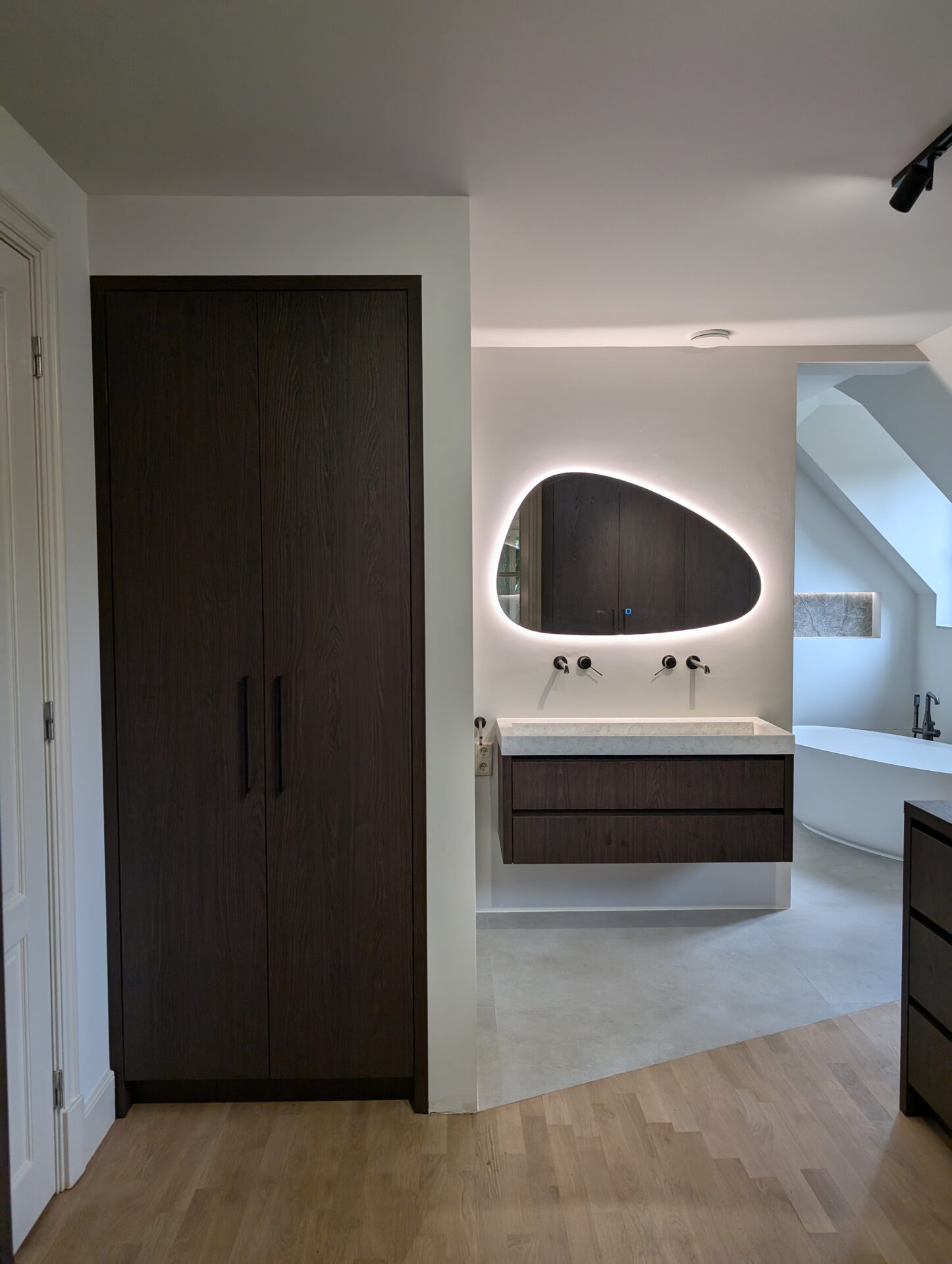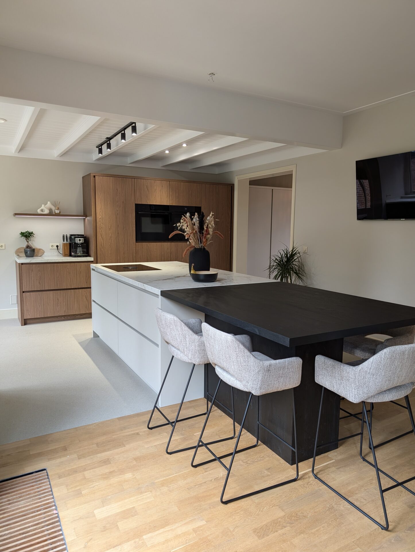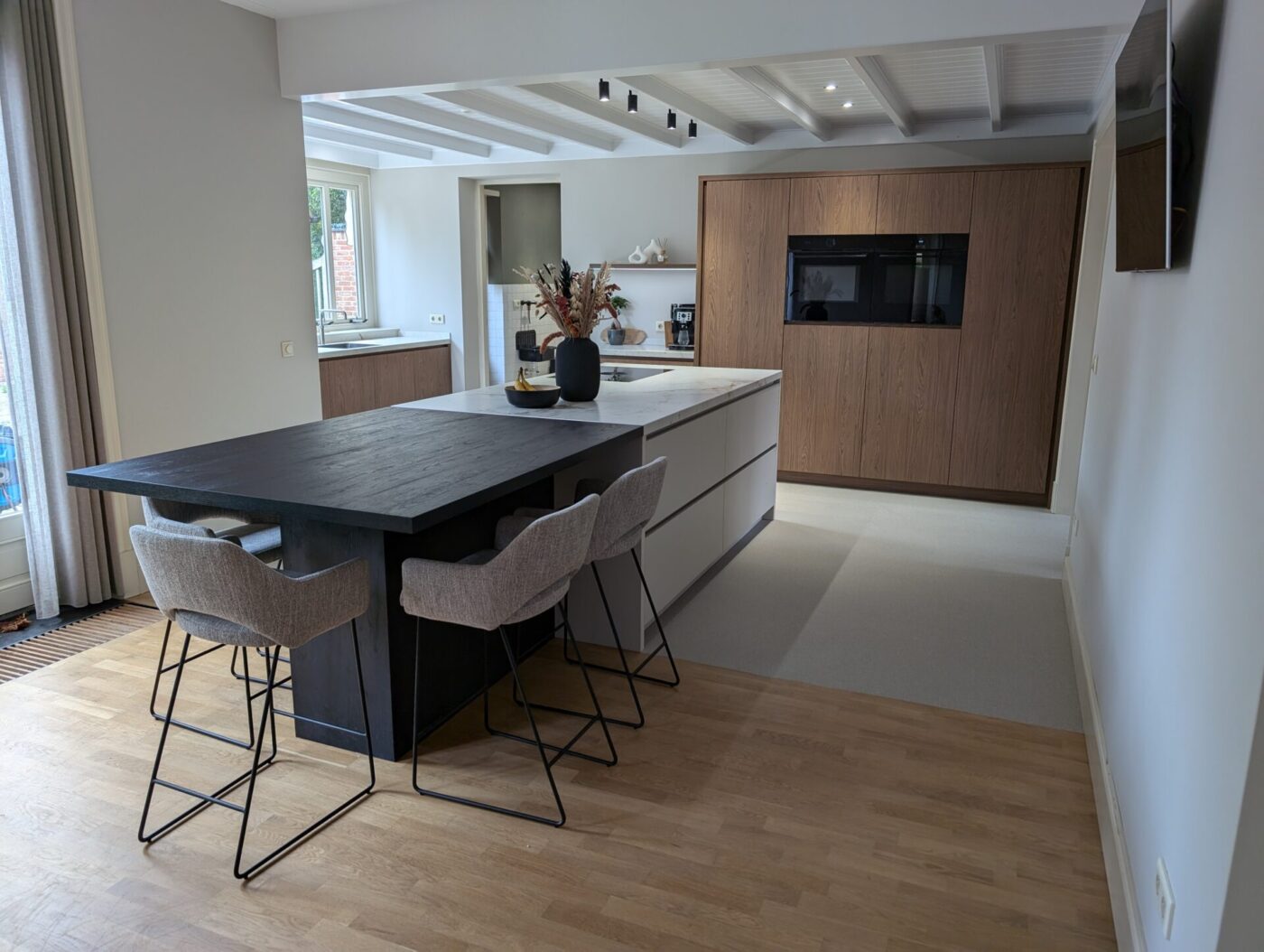 Bij Volmaak trekken we maatwerk door in het hele huis. We maakten onder andere een keuken, badmeubel, inloopkasten, werkruimte en tv-meubel, allemaal in één stijl, perfect op elkaar afgestemd.