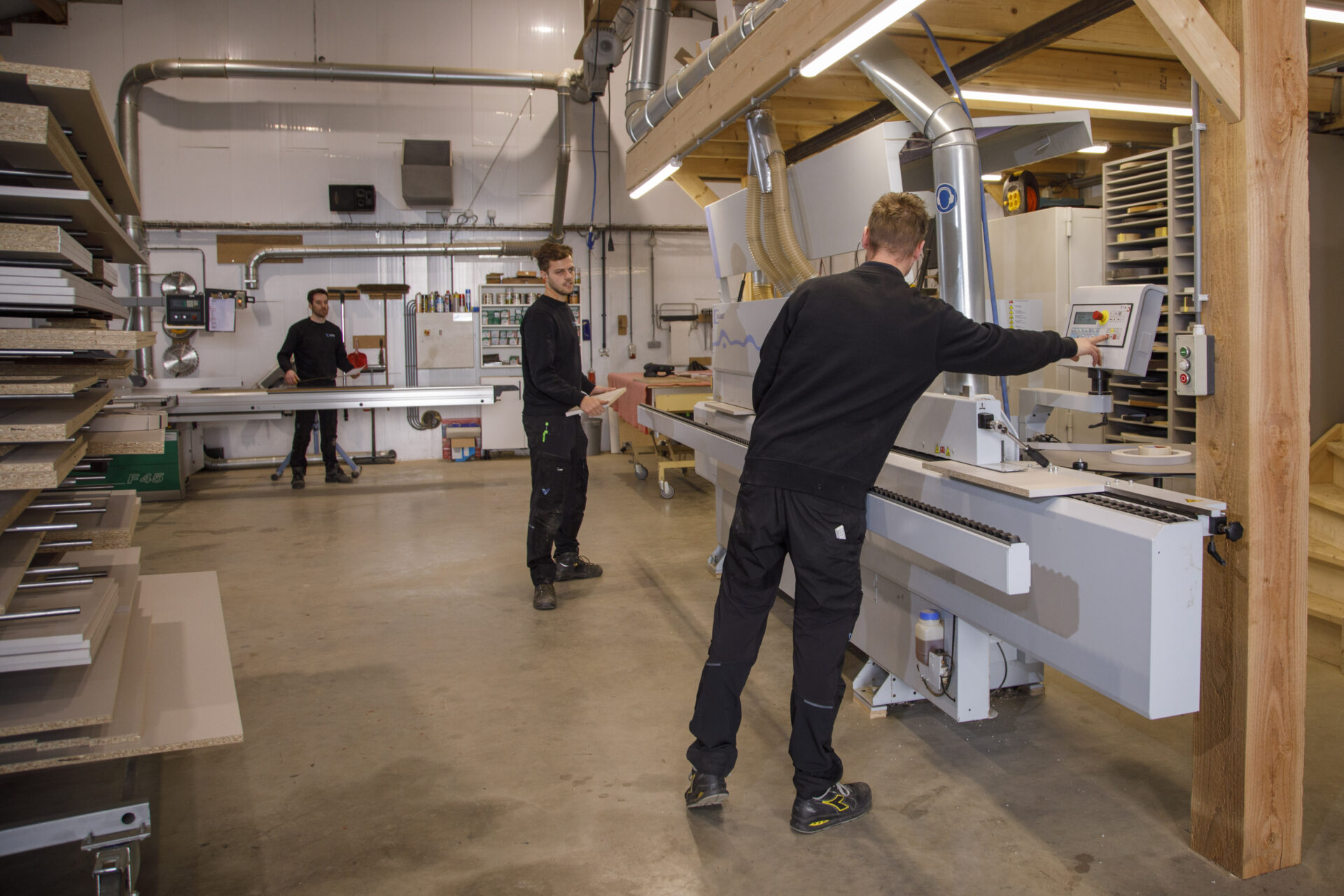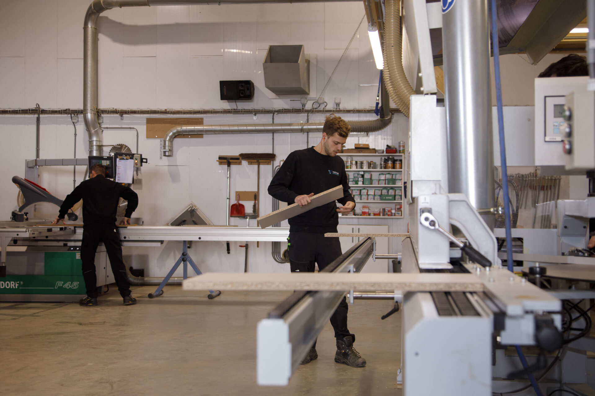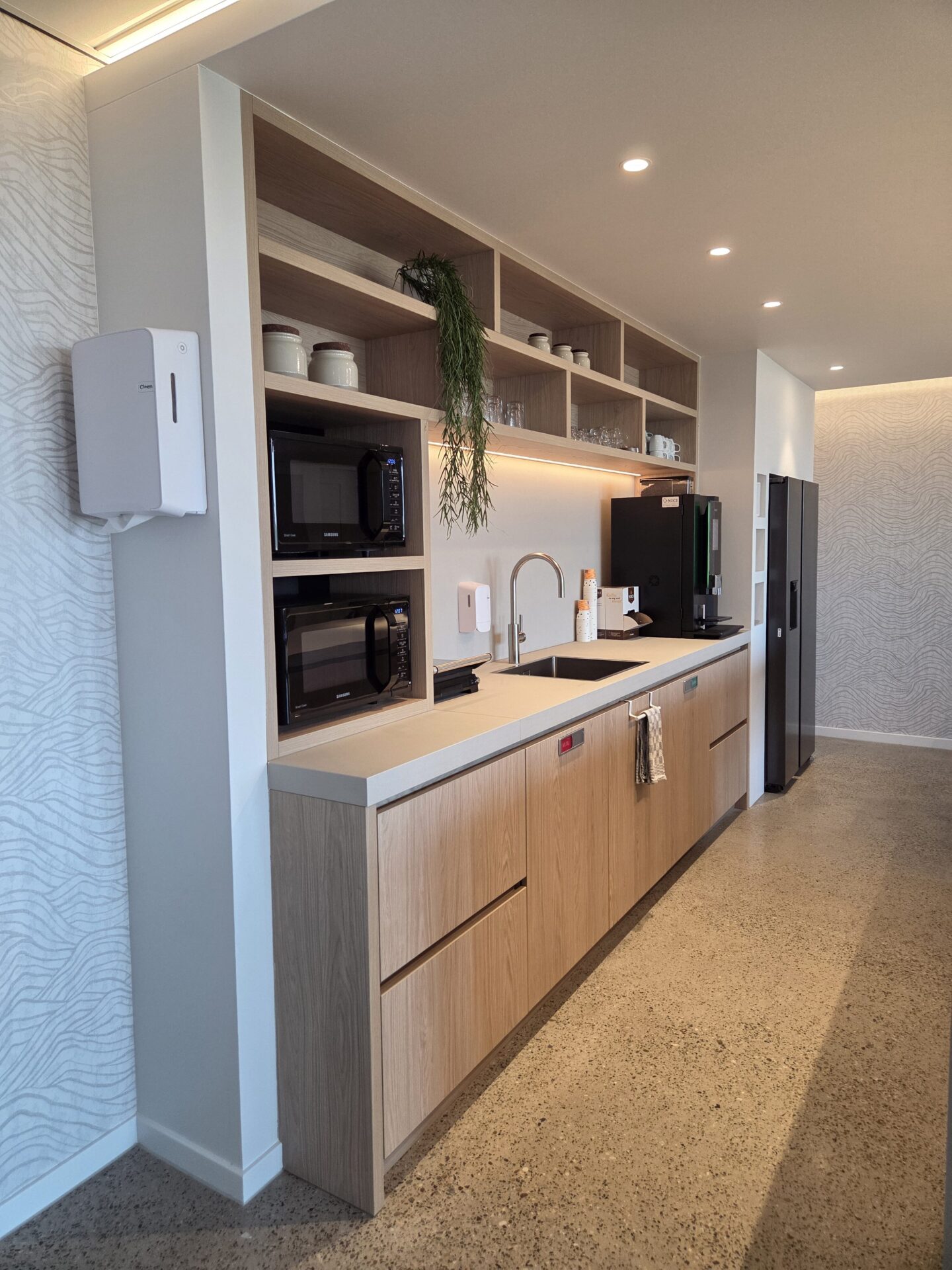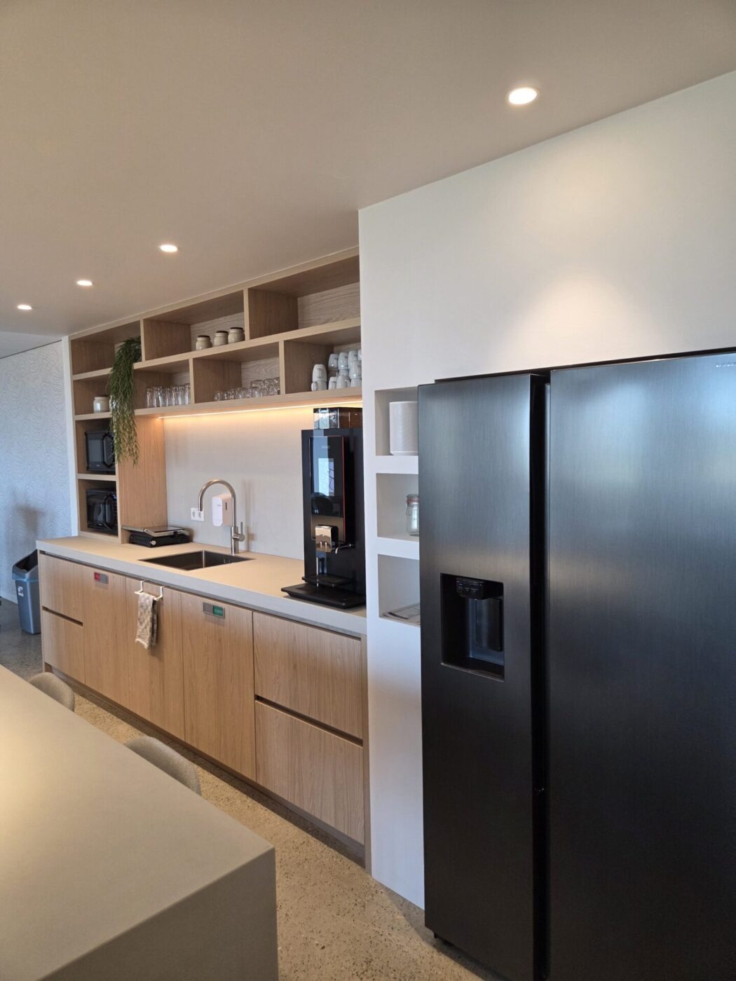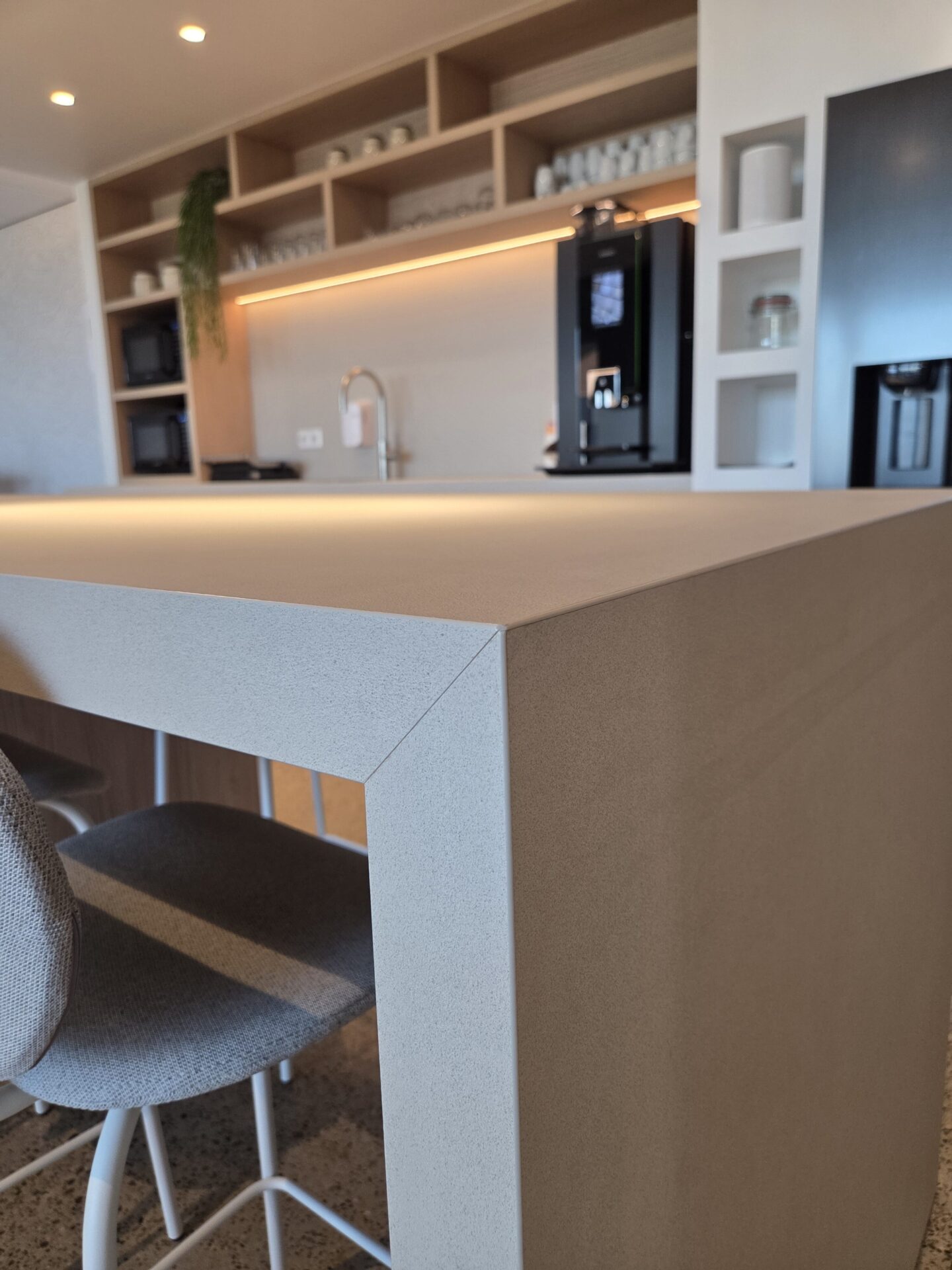 Kantinekeuken uitgevoerd met licht eiken deurtjes en een wit werkblad voor een frisse, moderne uitstraling. Boven de keuken bevindt zich een koof met ingebouwde LED-verlichting, die zorgt voor een warme en egale verlichting van het werkblad. De open vakken bieden extra opbergruimte en geven het ontwerp een speelse, open uitstraling, perfect voor een nette en gezellige kantine.