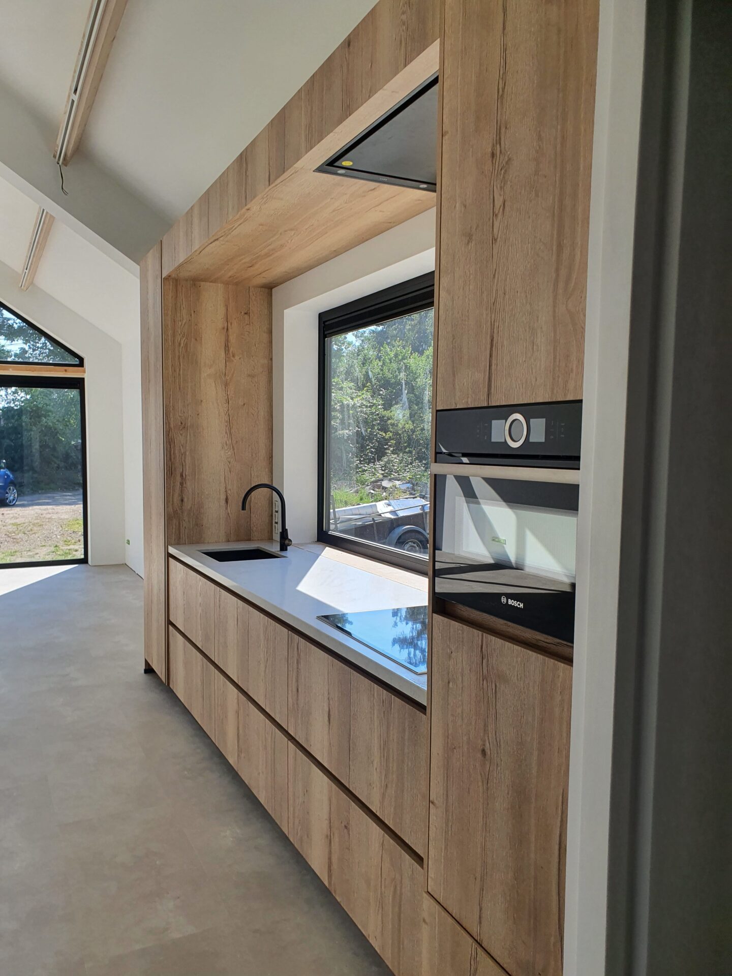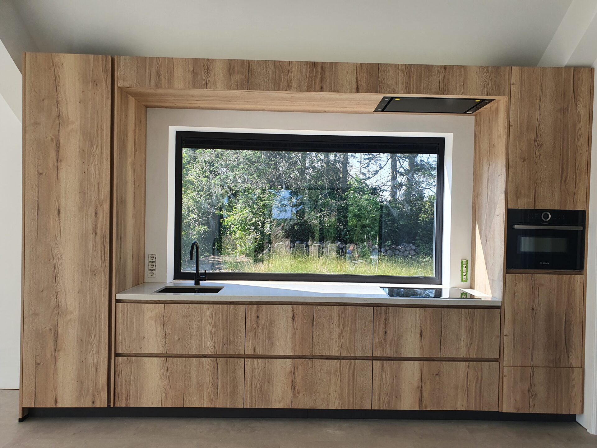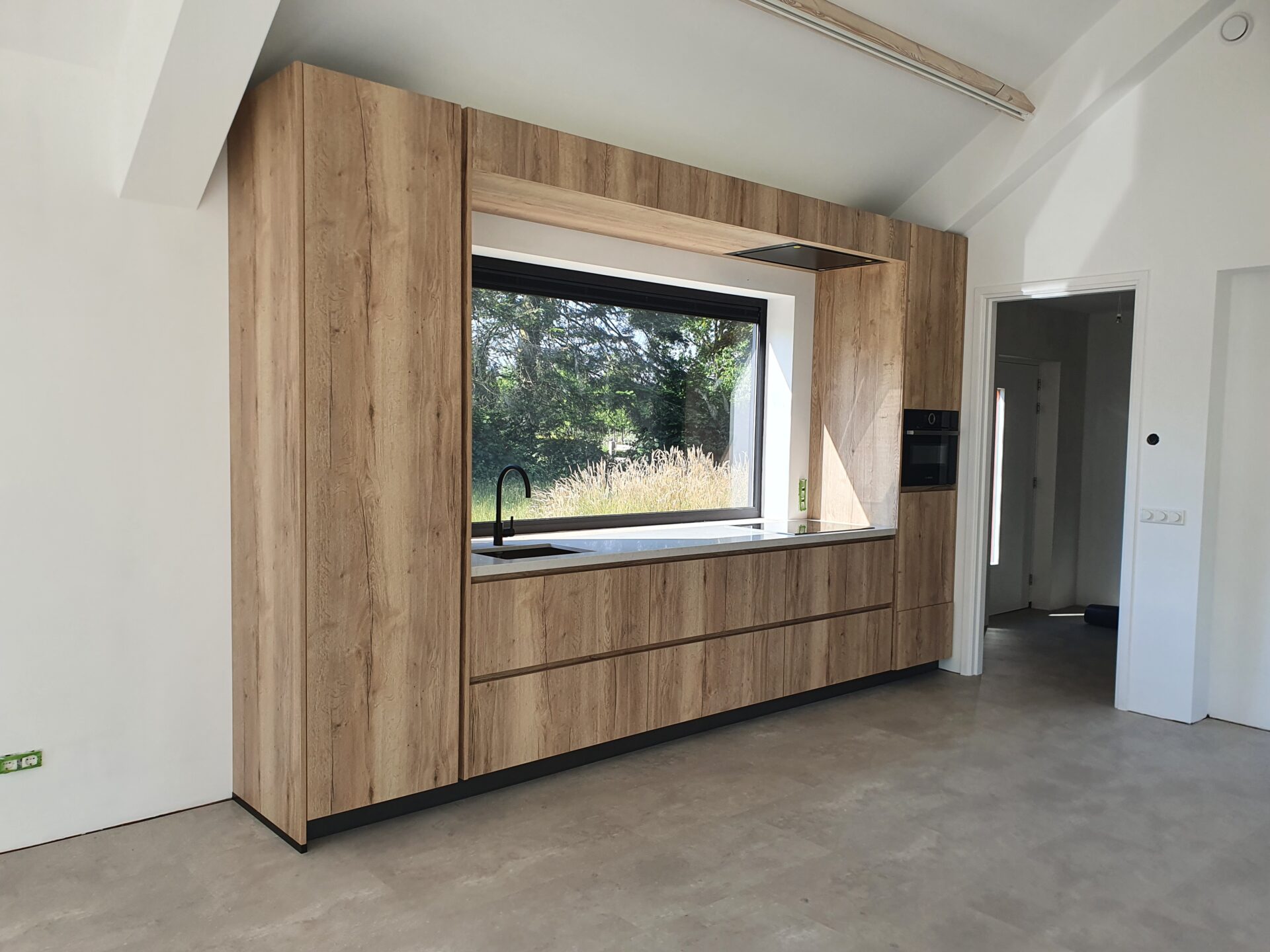 Deze moderne keuken combineert strakke lijnen met een warme houtlook. Het ontwerp is rondom het raam gebouwd, waardoor het daglicht centraal staat in het geheel. De geïntegreerde nis zorgt voor een uniek ruimtelijk effect en maakt van het raam een sfeervol middelpunt. Een minimalistische, maar karaktervolle maatwerkoplossing.