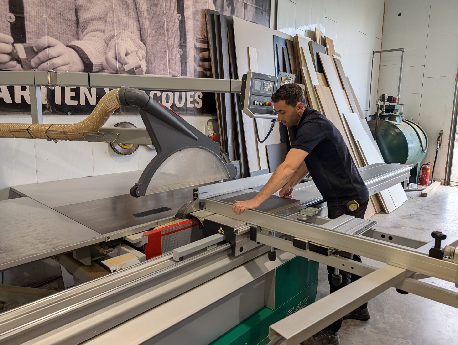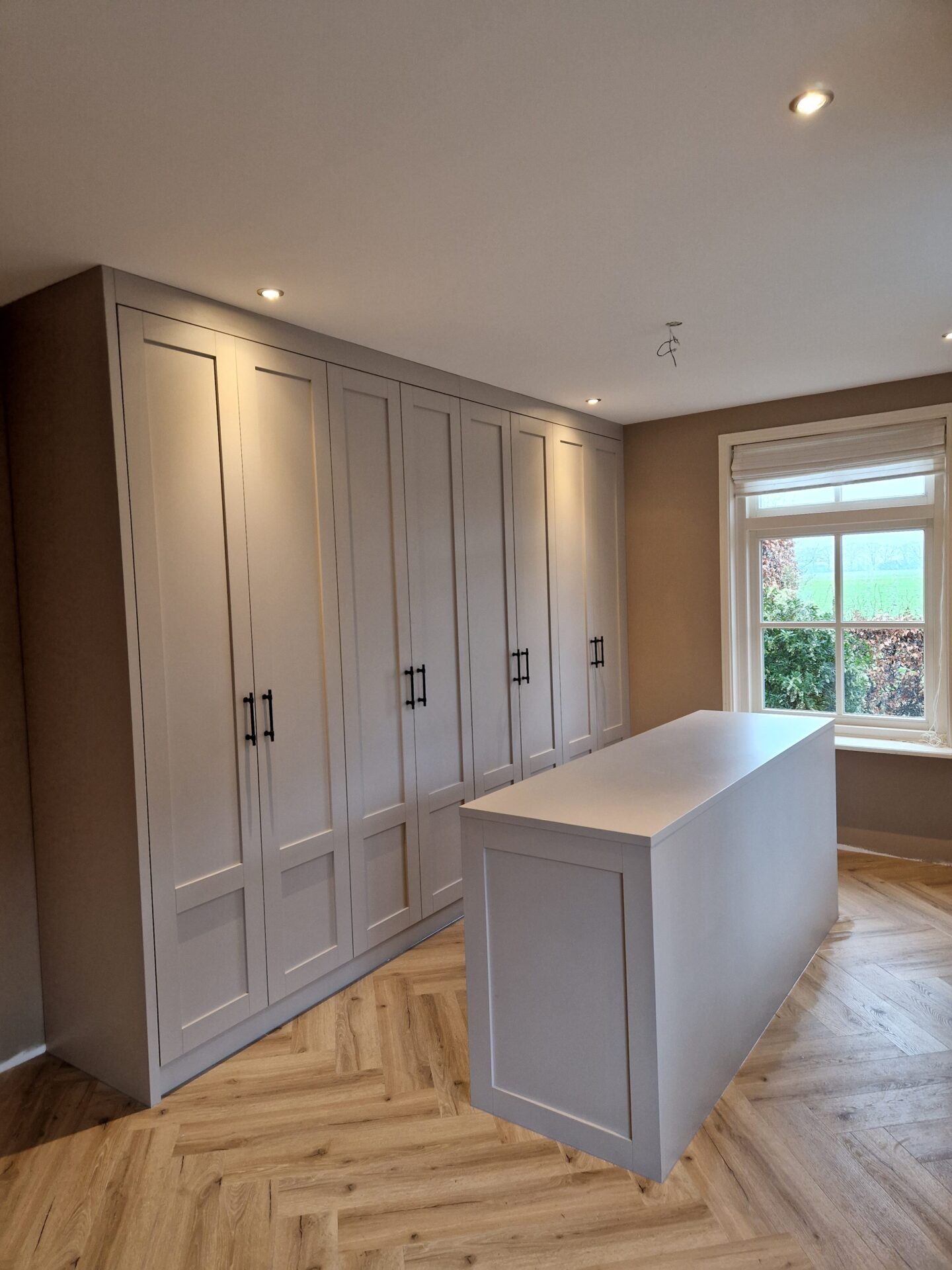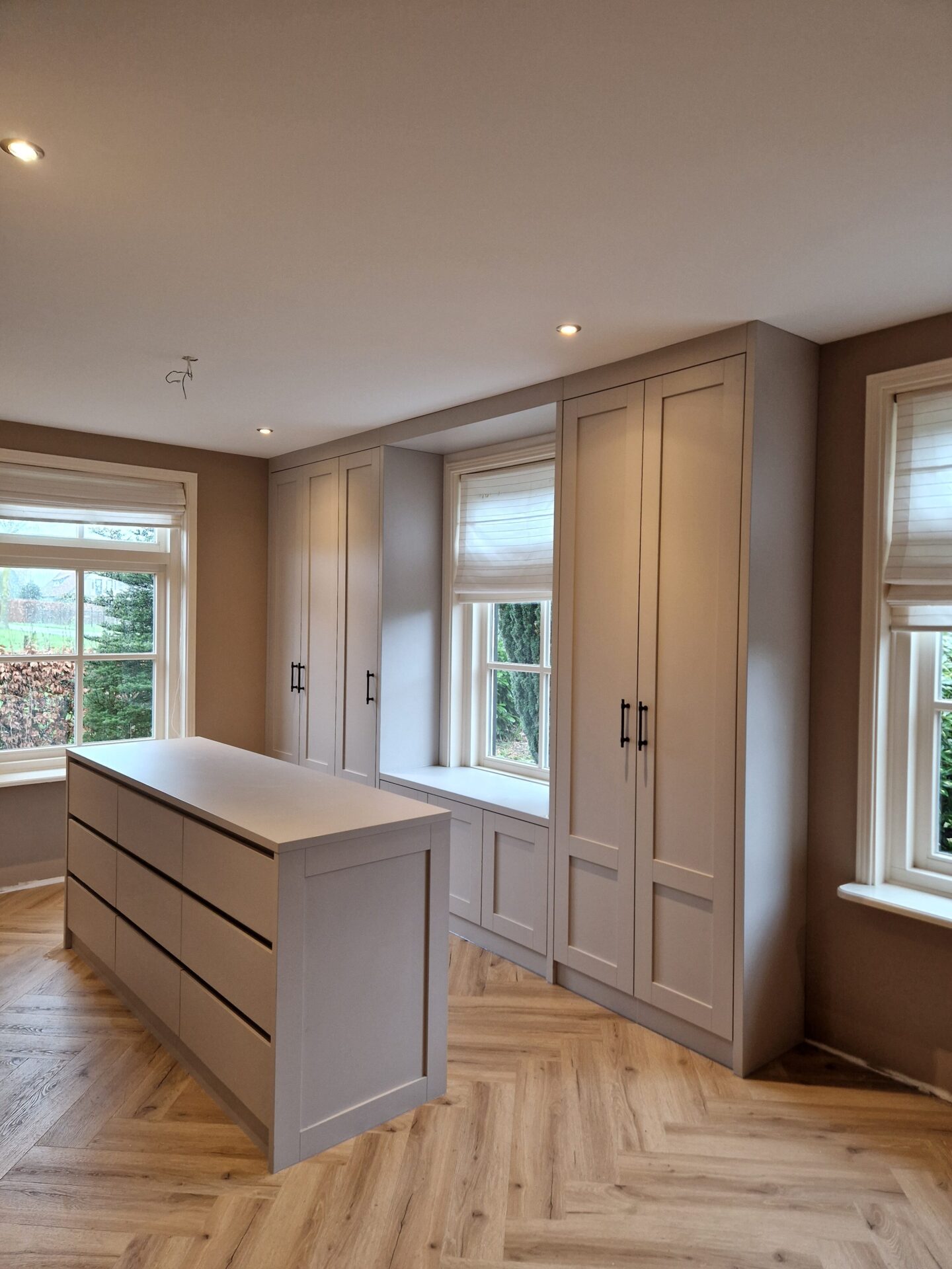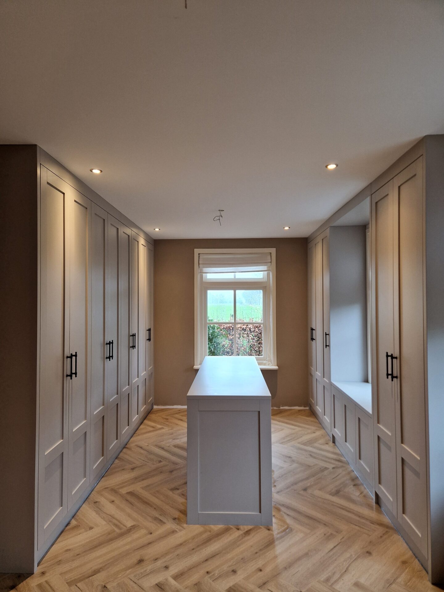 Een Klassieke inloopkast met paneeldeuren die elegant doorlopen in de dagkant van het raam, voor een perfect geïntegreerd geheel. In het midden staat een stijlvol eiland in een zachte, warme beigetint, prachtig gecombineerd met een eiken vloer. Een klassieke uitstraling met moderne afwerking en oog voor detail.