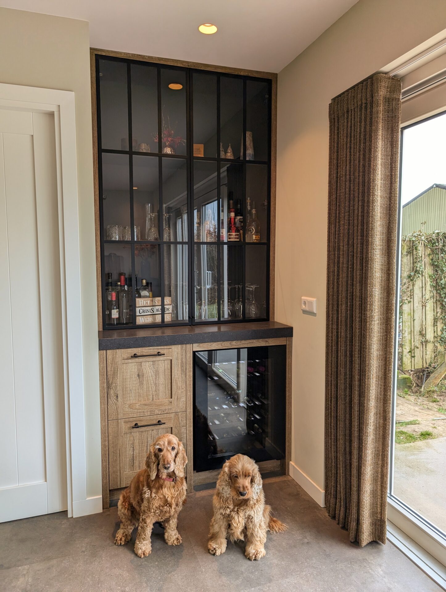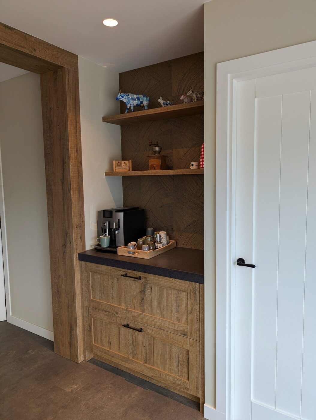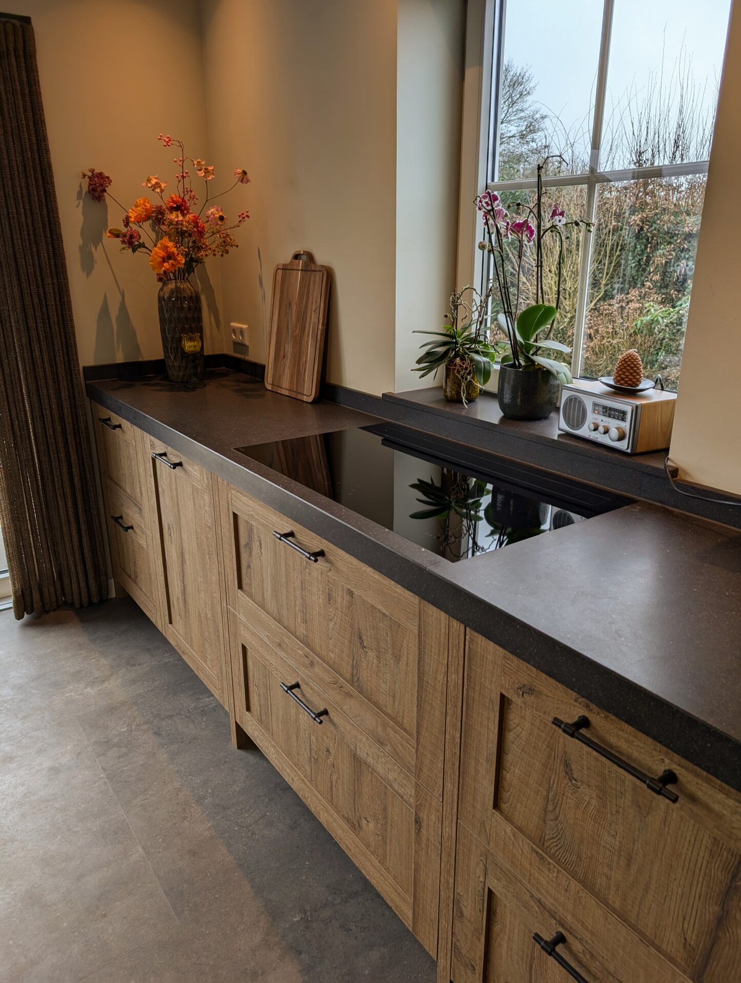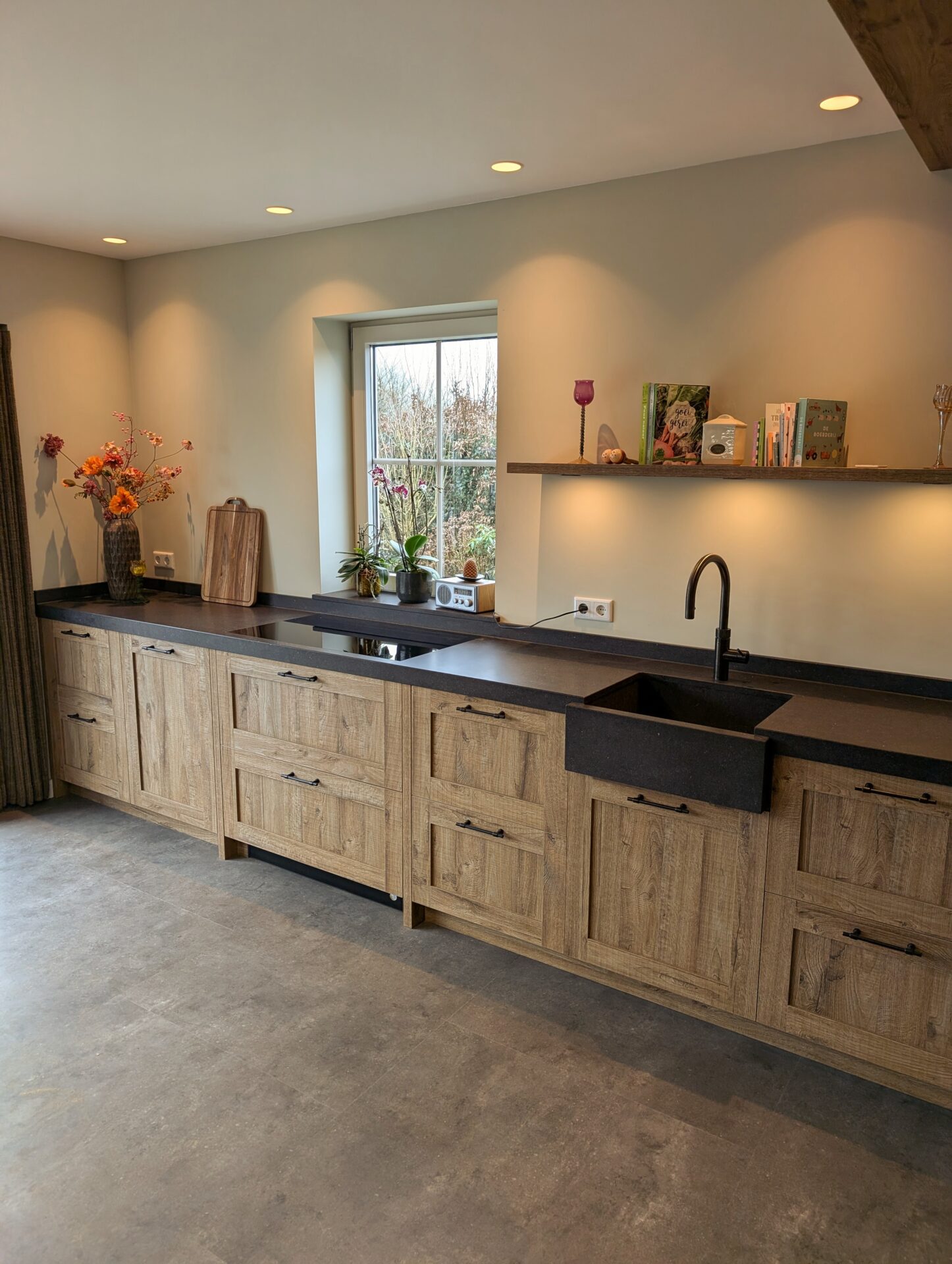 Een sfeervolle keuken in landelijke stijl, uitgevoerd in robuust hout met een natuurlijke uitstraling. Het zwarte werkblad en de nostalgische spoelbak vormen een krachtig contrast, terwijl open schappen en een vitrinekast zorgen voor charme en gezelligheid. Praktisch en uitnodigend, precies zoals een landelijke keuken hoort te zijn.
