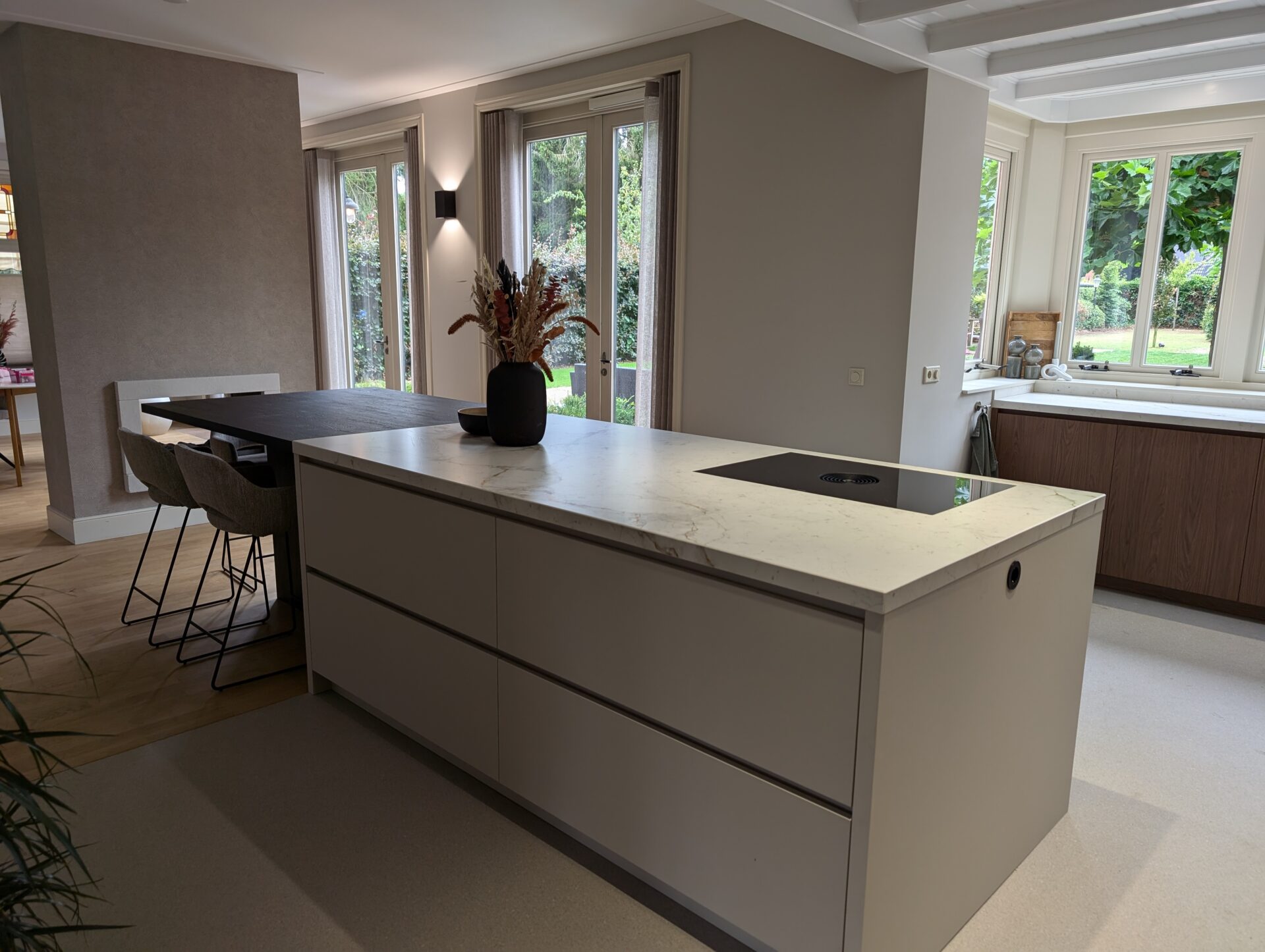 In samenwerking met interieurontwerpster Isa Brienen realiseerden we deze strakke maatwerkkeuken. Een krachtig samenspel van warme houttinten en minimalistische witte fronten, met oog voor detail en functionaliteit. Het resultaat is een keuken die naadloos aansluit bij de ruimte én de stijl van de bewoners.
