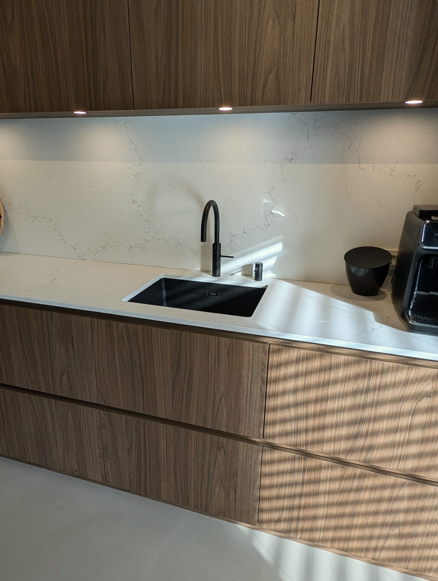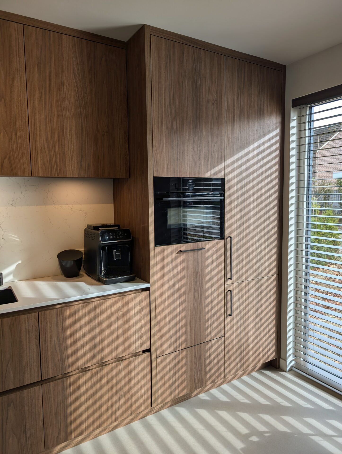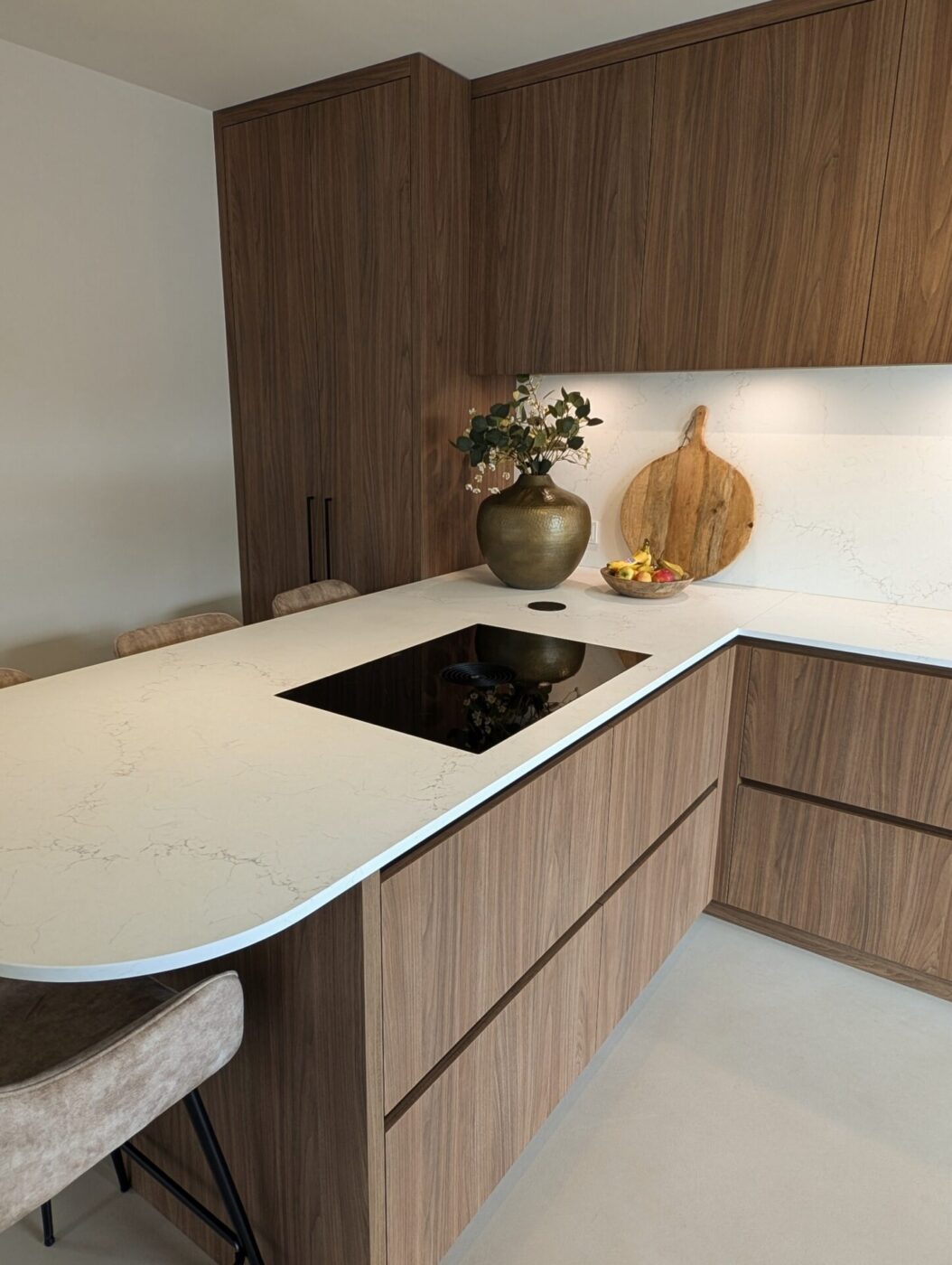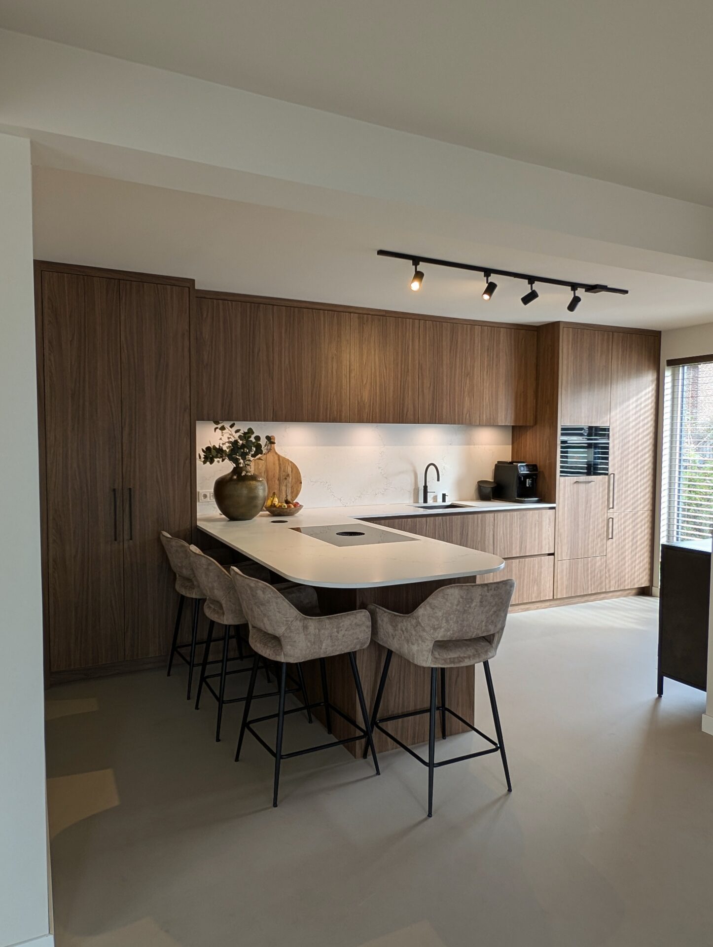 Strakke lijnen, warme notenhouten fronten en een stijlvol licht werkblad vormen de basis van deze moderne maatwerkkeuken. De vaatwasser is op hoogte geplaatst – een slimme en ergonomische oplossing die dagelijks comfort toevoegt aan een keuken waarin luxe, design en gebruiksgemak perfect samenkomen.