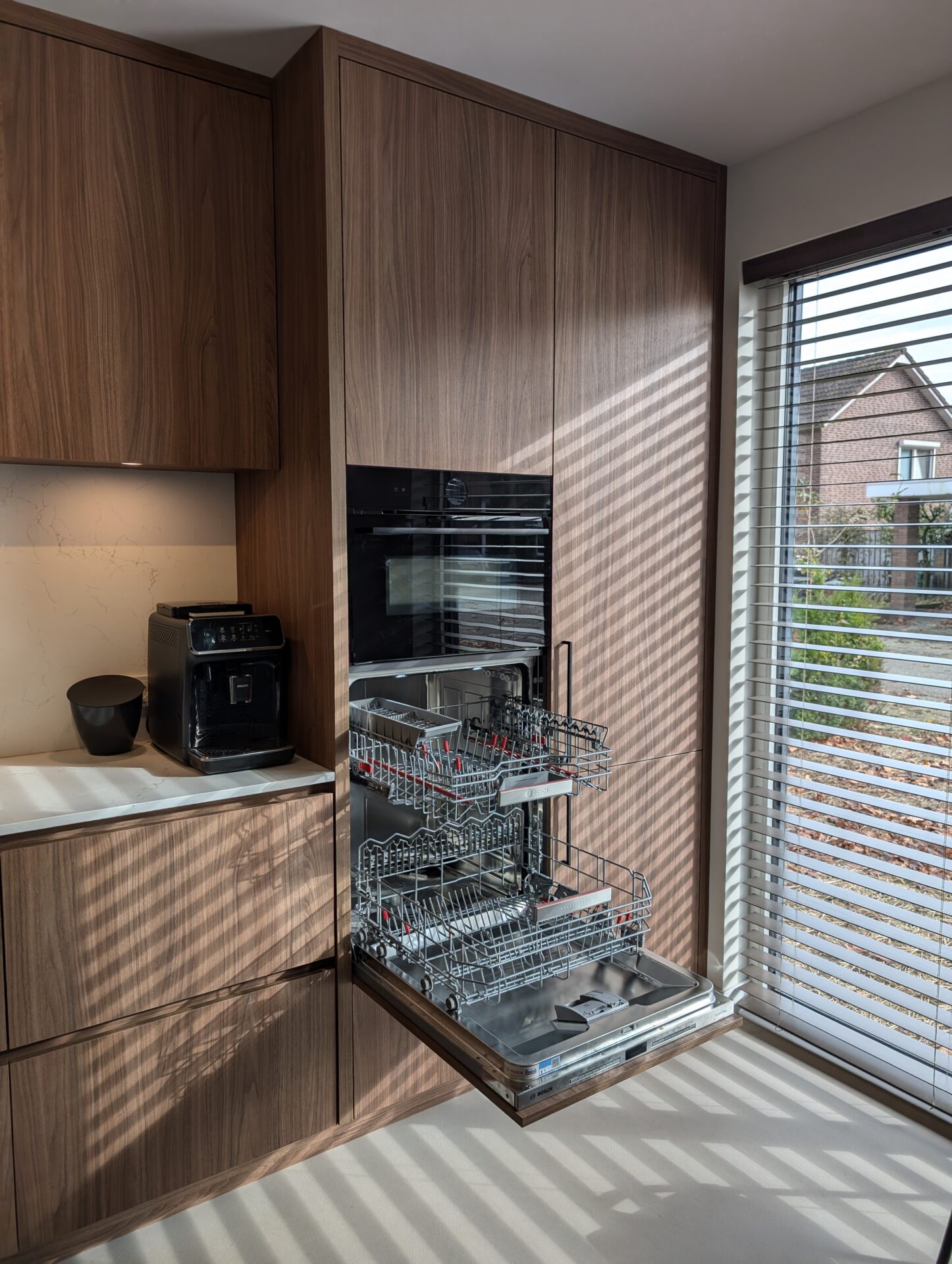 Moderne maatwerkkeuken in notenhout met vaatwasser op hoogte